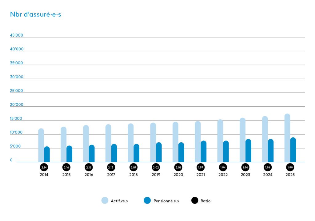 La progression des assurés actifs en 2025 a été de 851 personnes, soit de 5,2% par rapport à 2024. De son côté, le nombre de pensionnés a augmenté de 201 personnes (+2,4%). L’effectif des pensionnés est composé principalement de 64,0% de retraités et 18,2% d’invalides (temporaires et définitifs).